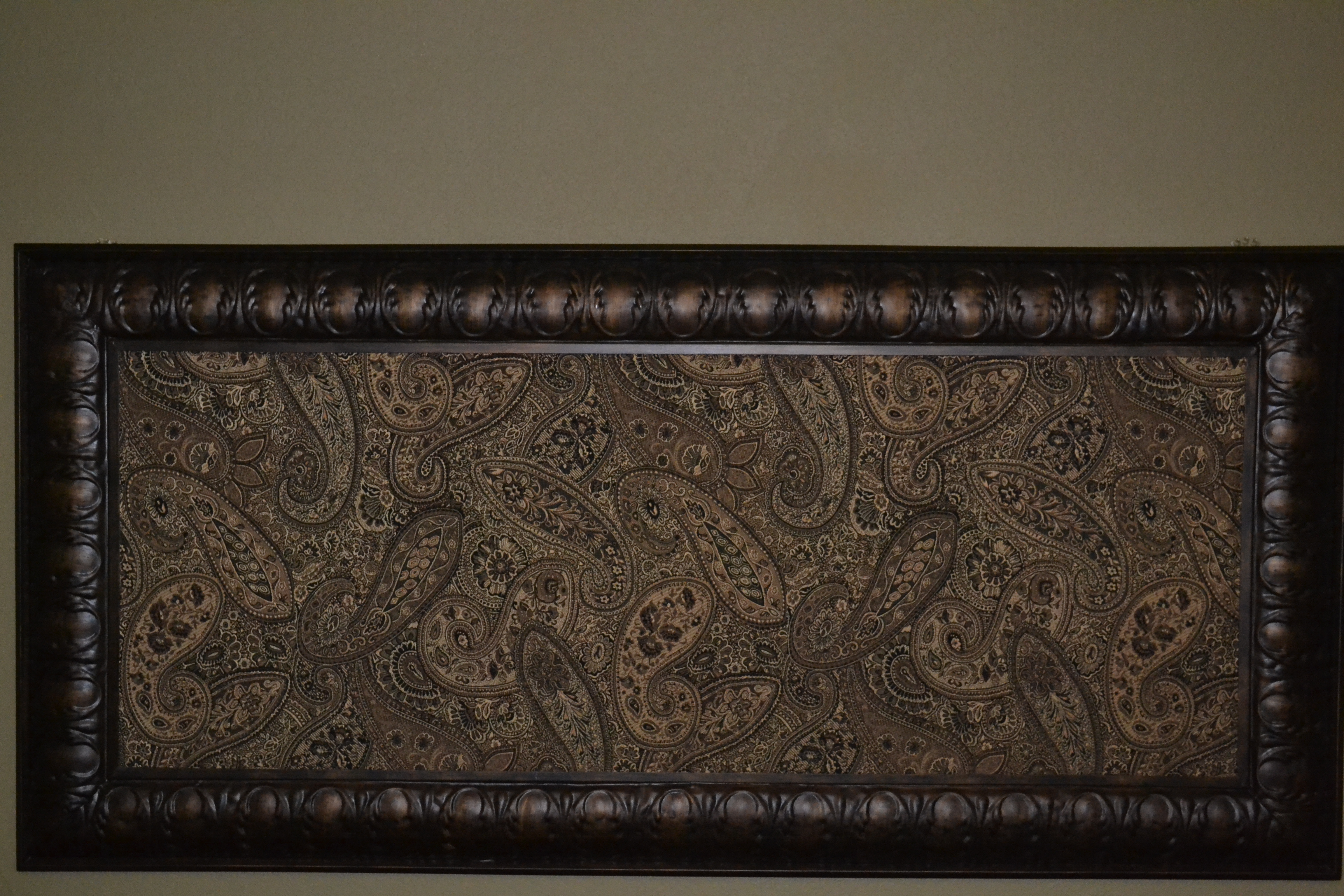 The above mirror is just an example of what was used for the below piece. I purchased the frame of a broken mirror from my local Hobby Lobby Store, on the clearance aisle. I then went to the fabric department and purchased home decor fabric. I popped the cardboard out of the metal frame and covered it in a thin layer of quilt batting (using double-sided tape). I then covered it in my chosen fabric, rolled out the wrinkles and taped it on the back, before popping it back into the metal frame. This is now used as our headboard. It simply hangs on the wall and was a very inexpensive and fun project! (I’ve changed the fabric out on it a couple of times.)