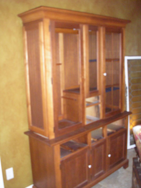 With a lot of ingenuity and hard work, she now has a beautiful hutch. Since this photo was taken, she has painted the inside a lighter color which makes it “pop” even more!