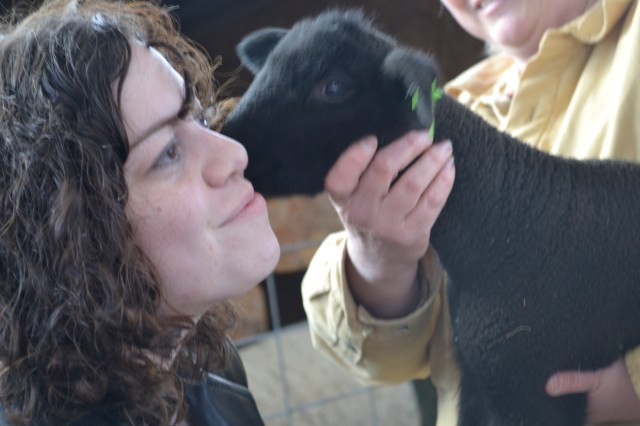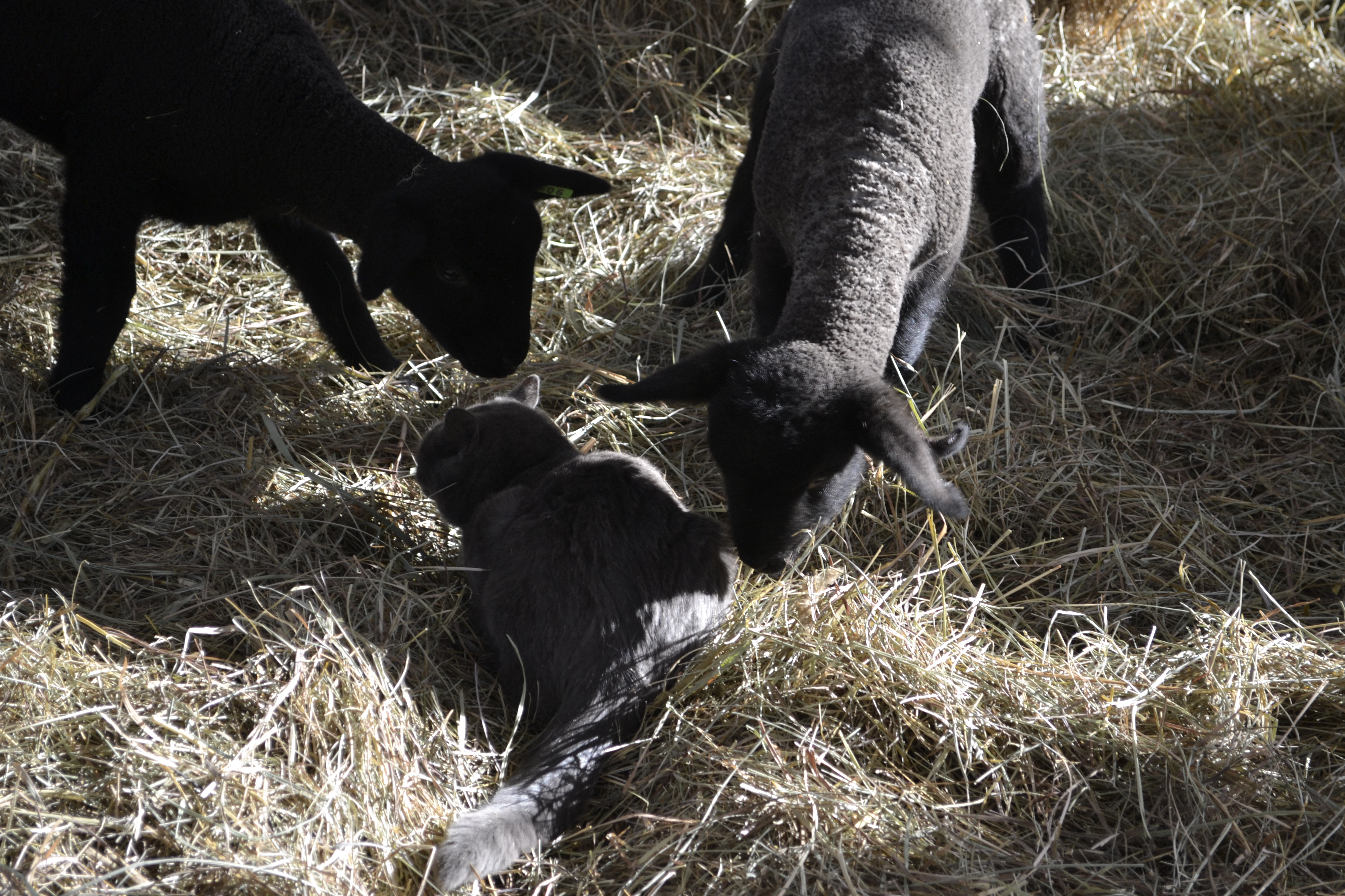 Here are the two-week old twins, Snickers and Violet. (born Feb 17) They are extremely curious about Pookey, the kitty. (Their mama is Serta….perfect name for a sheep, don’t you think?!) These little gals were very cute and talk about energetic!