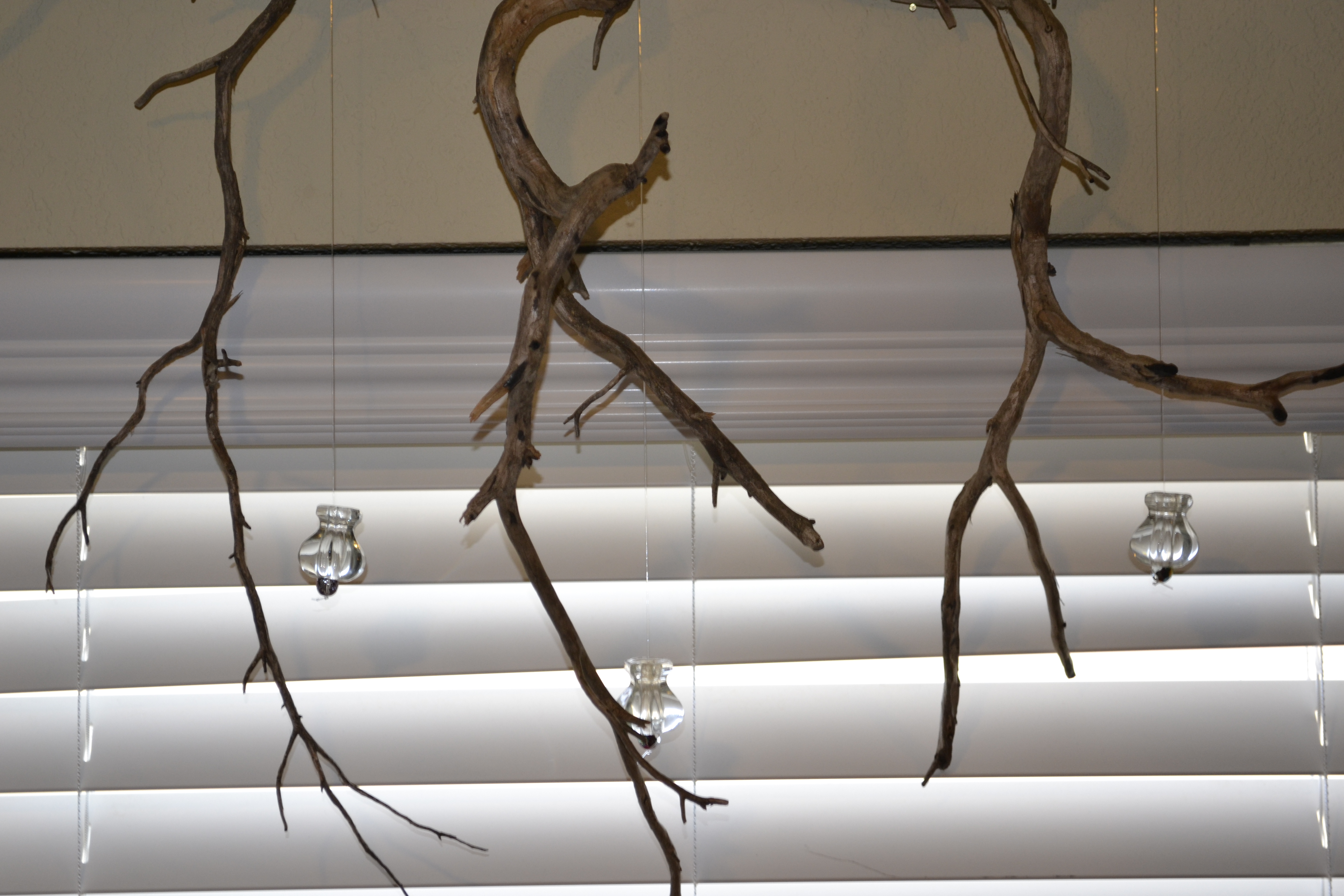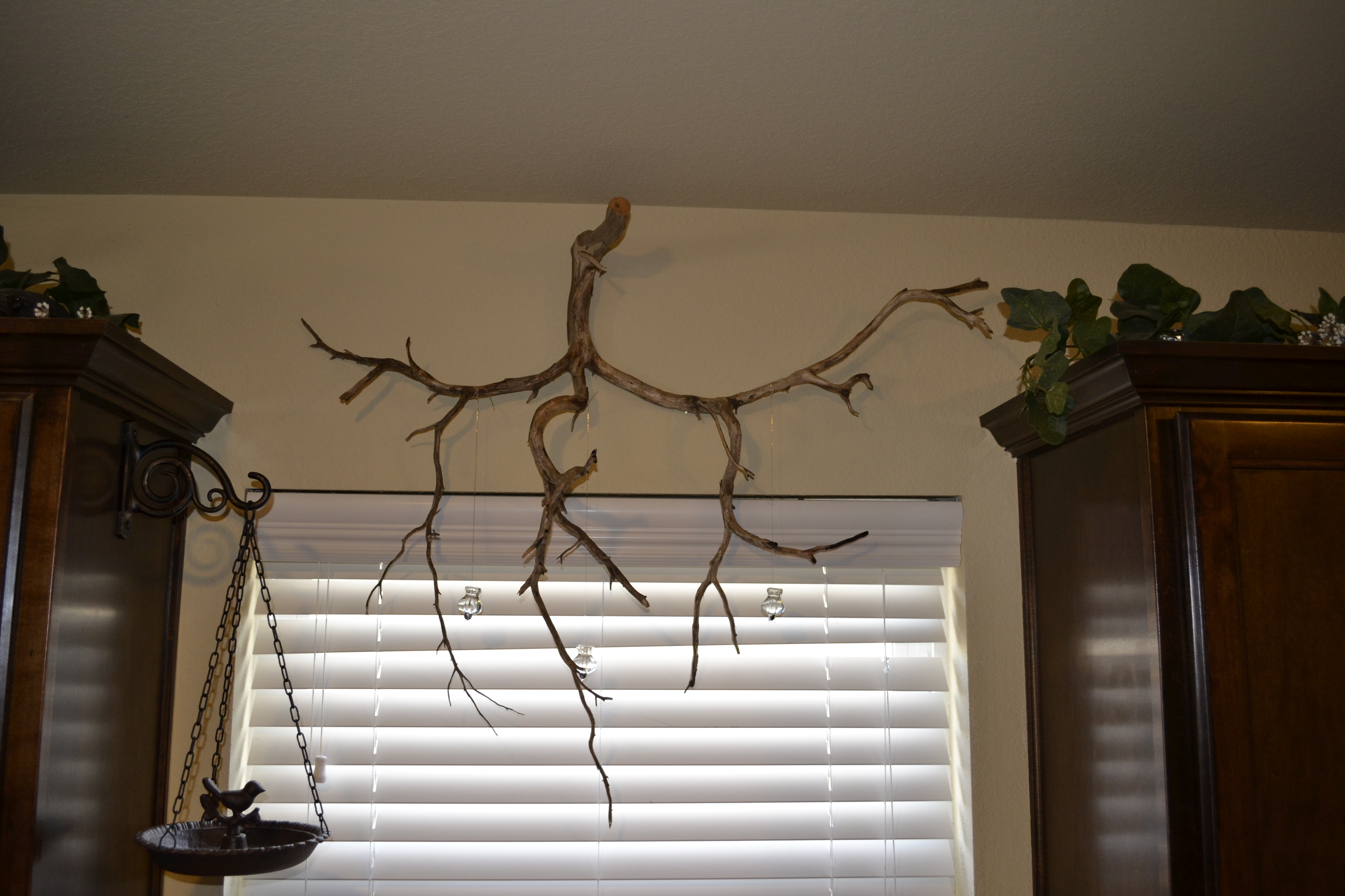 I love trees and sparkly things.  My mom gave me some antique crystal knobs from a house we lived in when I was a kid.  I didn’t want to throw them in a drawer because they were beautiful AND sentimental.  So I was inspired one day while I was ironing and staring towards the kitchen window. I strung them on clear jewelry wire and added a prismatic glass bead base.  The added bonus to the window was the cast iron bird feeder my daughter in-love (Erin) had given me.