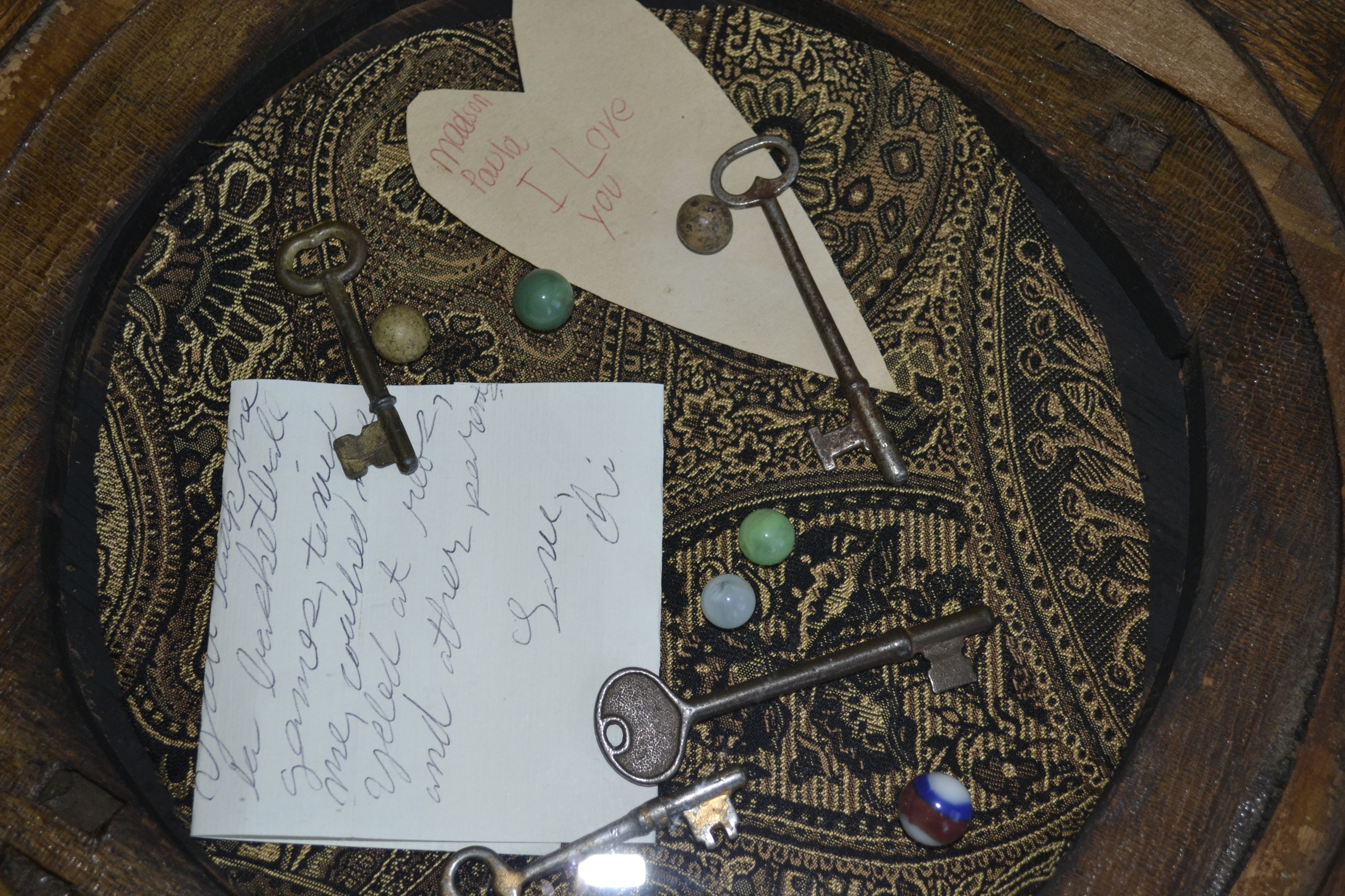 I painted the inside black and attempted to line with some fabric I already had.  I enjoyed placing treasured notes my boys had written to me when they were little guys.