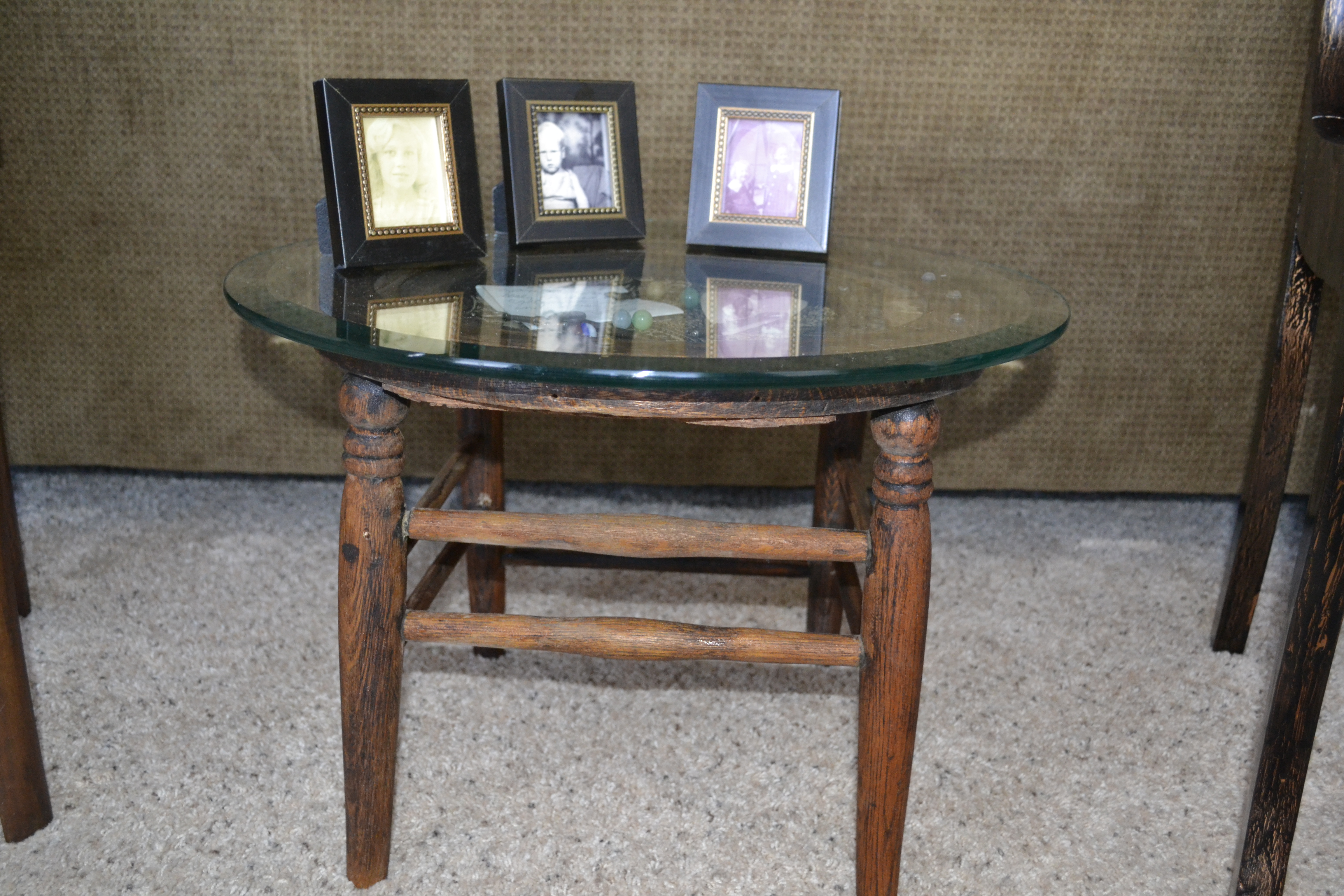 I bought a glass table top (CHEAP at half price!) from Hobby Lobby and wallah….a little display table. (not the greatest photo angle, but hopefully you’ll get the concept)
