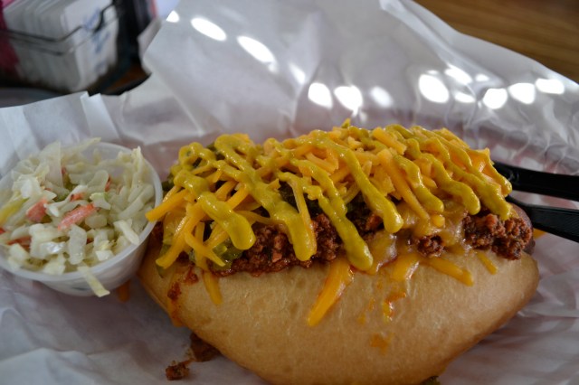Mine was a “custom” because I wanted a normal hotdog. Once I got the hotdog wiener out, it was perfect! Plus, now that I’ve tasted the spicy coleslaw, I will get a BIG heaping of that next time! (my cholesterol food for the week!)