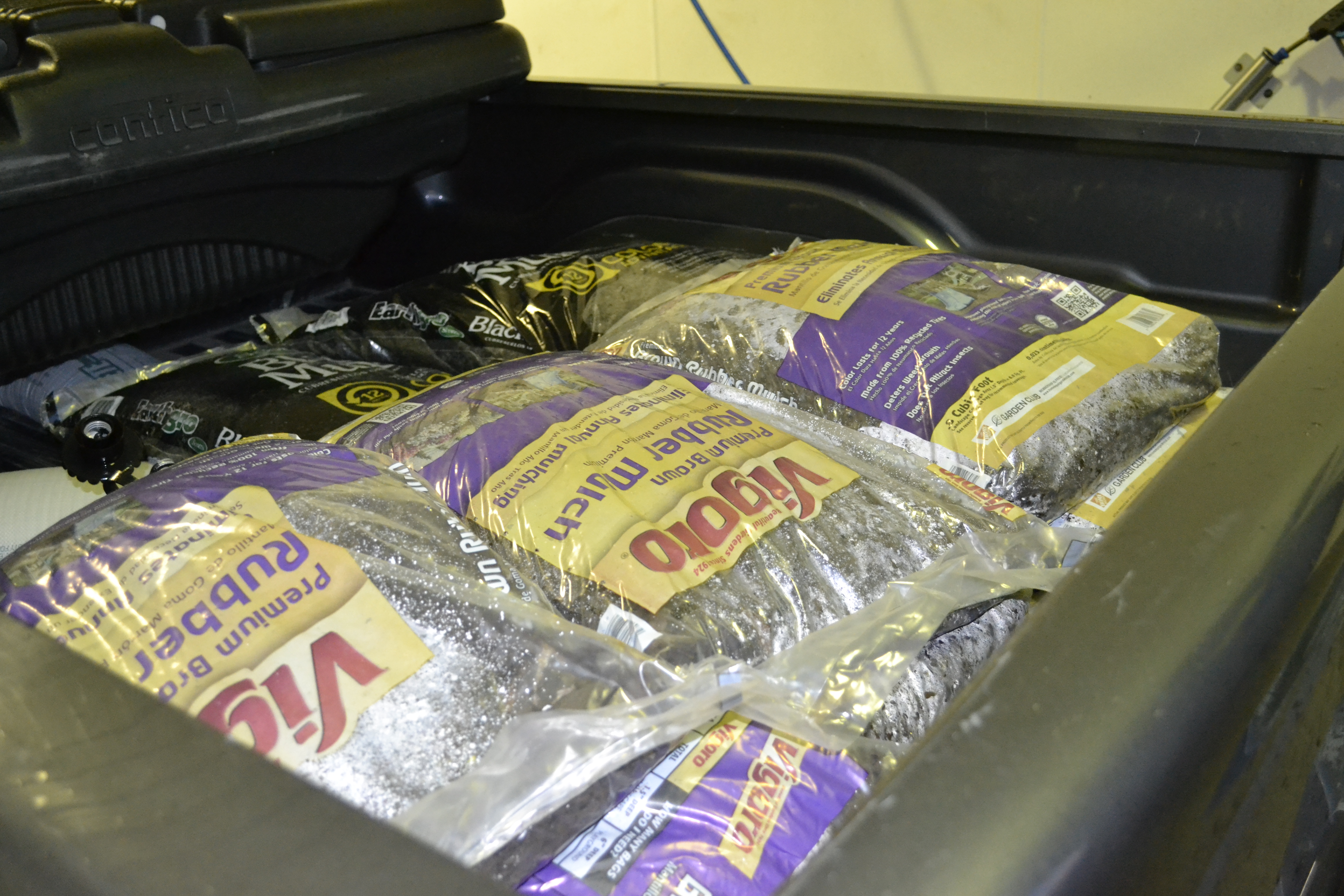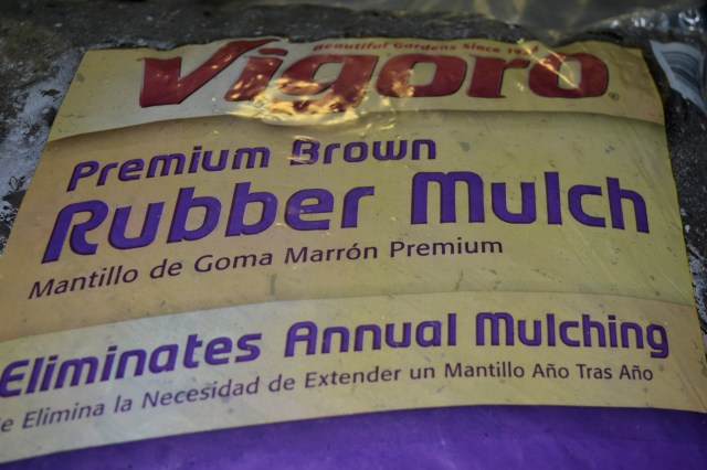 The past weekend involved a work in the front yard day.  March 31.  Our temp reached 92 degrees.  Regardless, we made the trip to Home Depot (twice), loaded up with mulch, and started the job.  The past couple of years we have debated on trying the rubber mulch.  The company claims that the color lasts 12 years.  That it will save you work and money not having to re-mulch year after year.  No, I don’t believe them.  Scotts has a one year color guarantee on their regular mulch and the reality has been about two months, maybe three for our sun in Oklahoma.  After visiting with my sister though, (no pressure, Renae!) we decided to go with the rubber mulch this year.  The cost is quite a bit more.  But if VIGORO’s word is true, we’ll be in good shape.  Plus, this time I am keeping the receipt and a bag.  I will “call” them on it if there is a problem AND let you know, too!