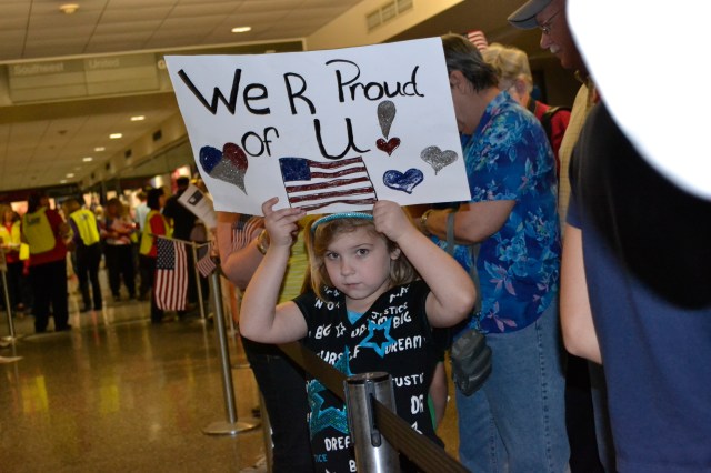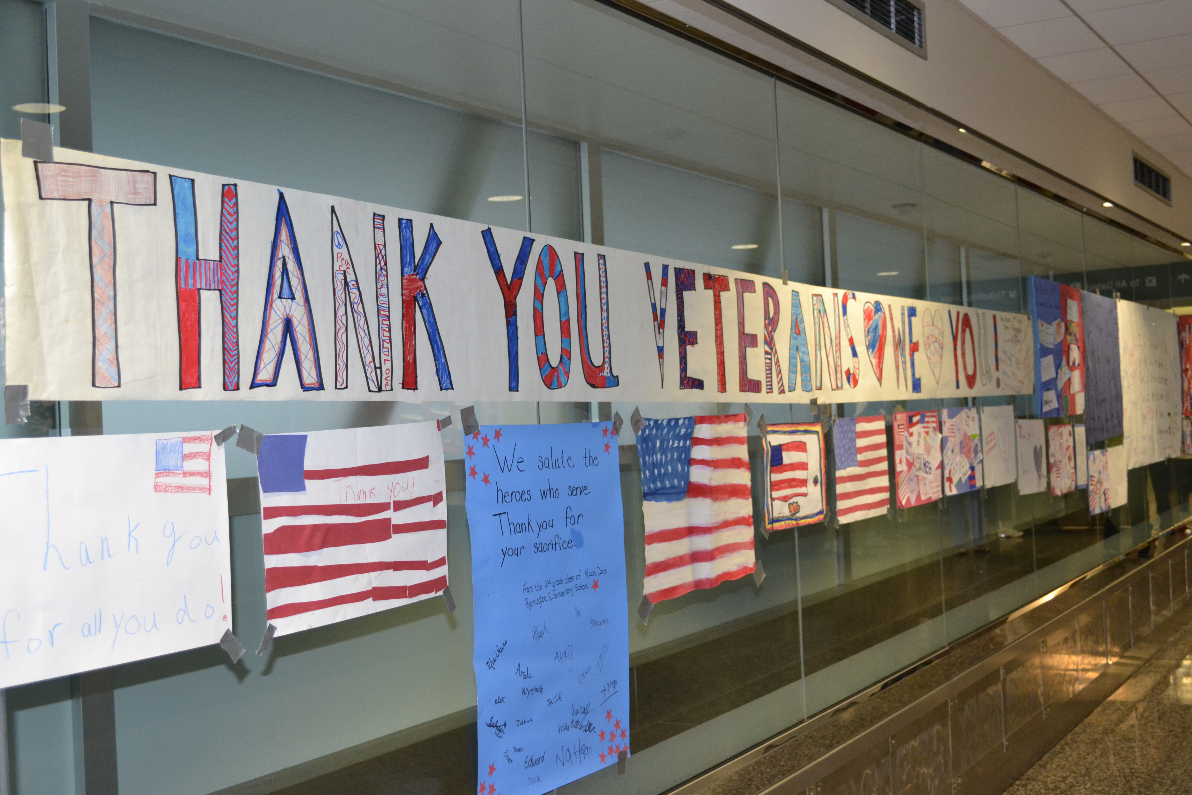 The feeling in the airport was festive. Young and old gathered together, flags waving, music playing, all to welcome home our heroes. The lines on each side of the wall grew longer by the minute, extending from the gate to the airport’s front entrance. When the announcement was made that the plane had landed, the crowd exploded into cheers. And then finally, after a lengthy wait, the parade began. One by one. Each escorted by a volunteer. I was so excited to take pictures! But then I saw the first Veteran’s face, so surprised with the homecoming, tears streaming down his face….my hand was reaching out to touch his. He needed to know how much I appreciated his service to our country. As he squeezed my hand, there was so much I wanted to tell him. And then the next, and the next Veteran…..then my brain said “PICTURES!” So I did take many photos, I didn’t even realize that tears were streaming down my face too, until my blurry camera lens showed evidence. The emotion was overwhelming. So these pics are for you, friends. And they are for me. Please know that they are from my heart. But the imperfections are present because, well ~I had heroes to greet. Over One Hundred ~