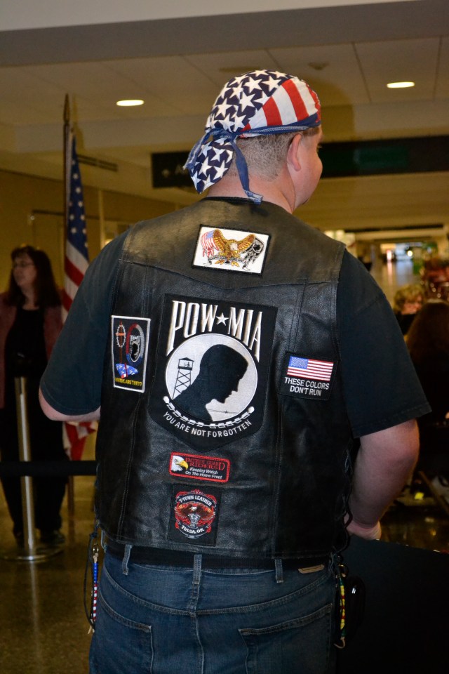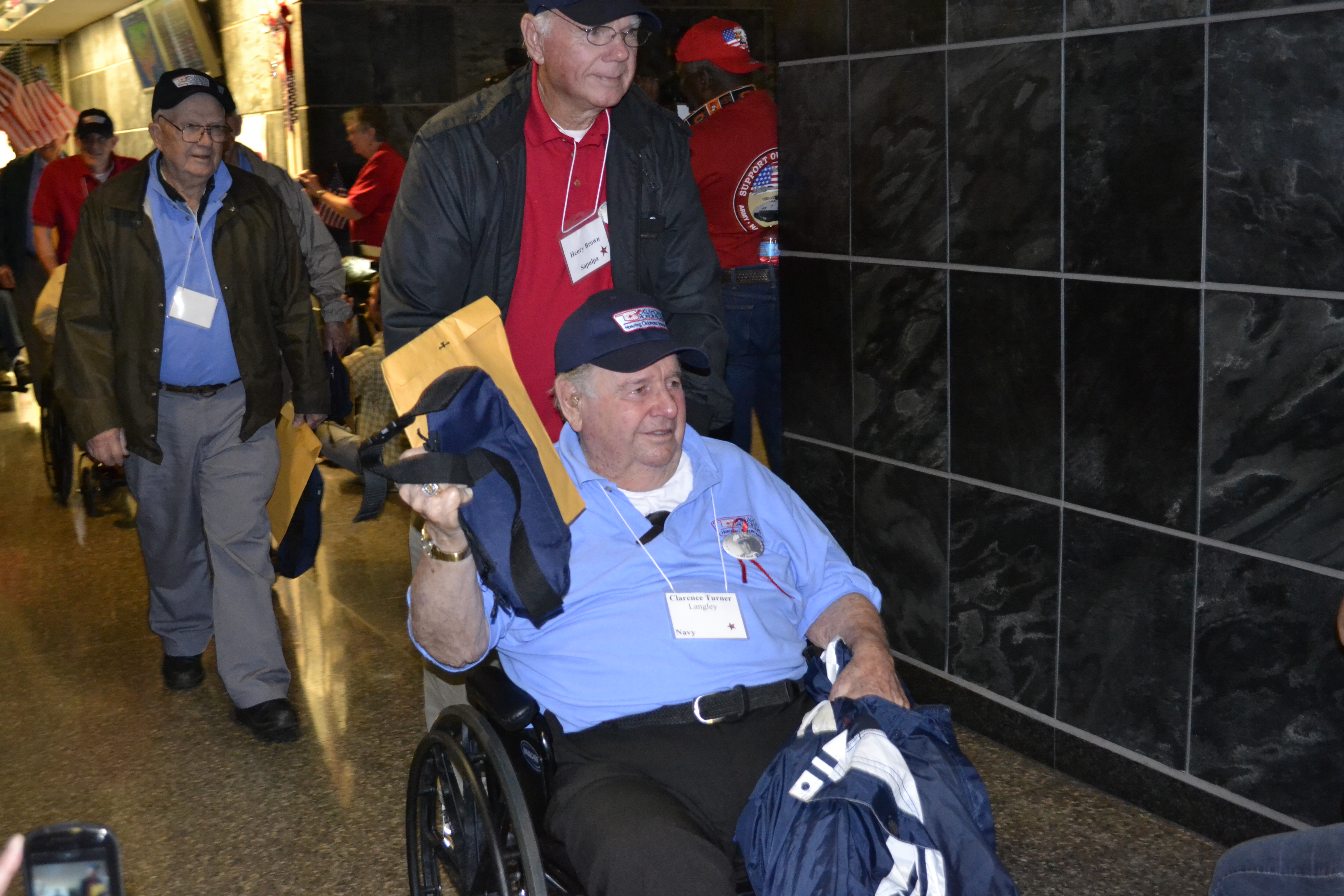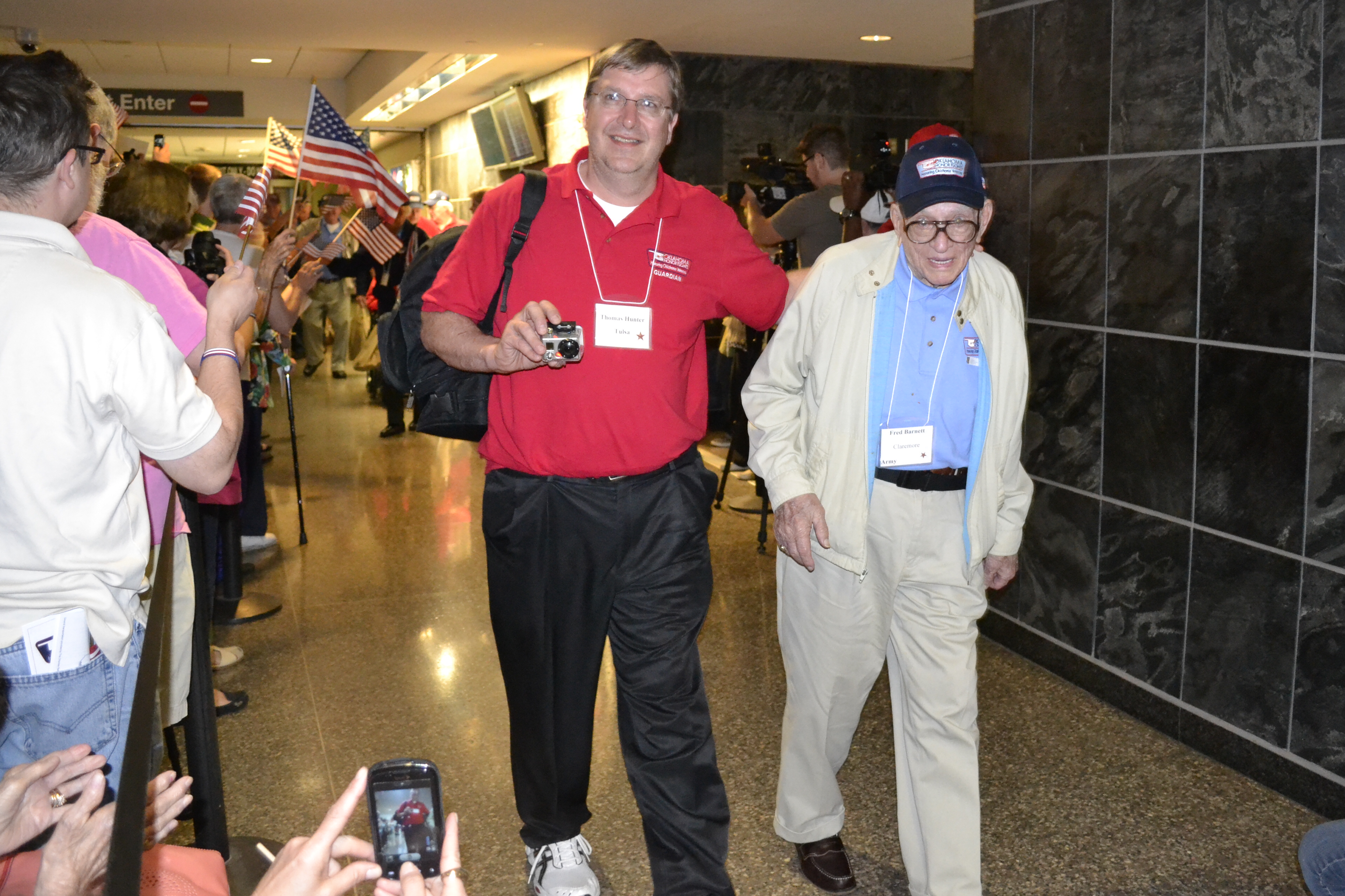 There were dozens of Patriot Guards and Oklahoma Honor Flight’s Ground Crew. Even a band from a local Tulsa homeschool group, entertained with patriotic tunes. Mary stood next to us. Her sweet mother was in a wheelchair and was there to welcome her husband of 63 years home from this flight. She clutched her flag in her hands and waited.