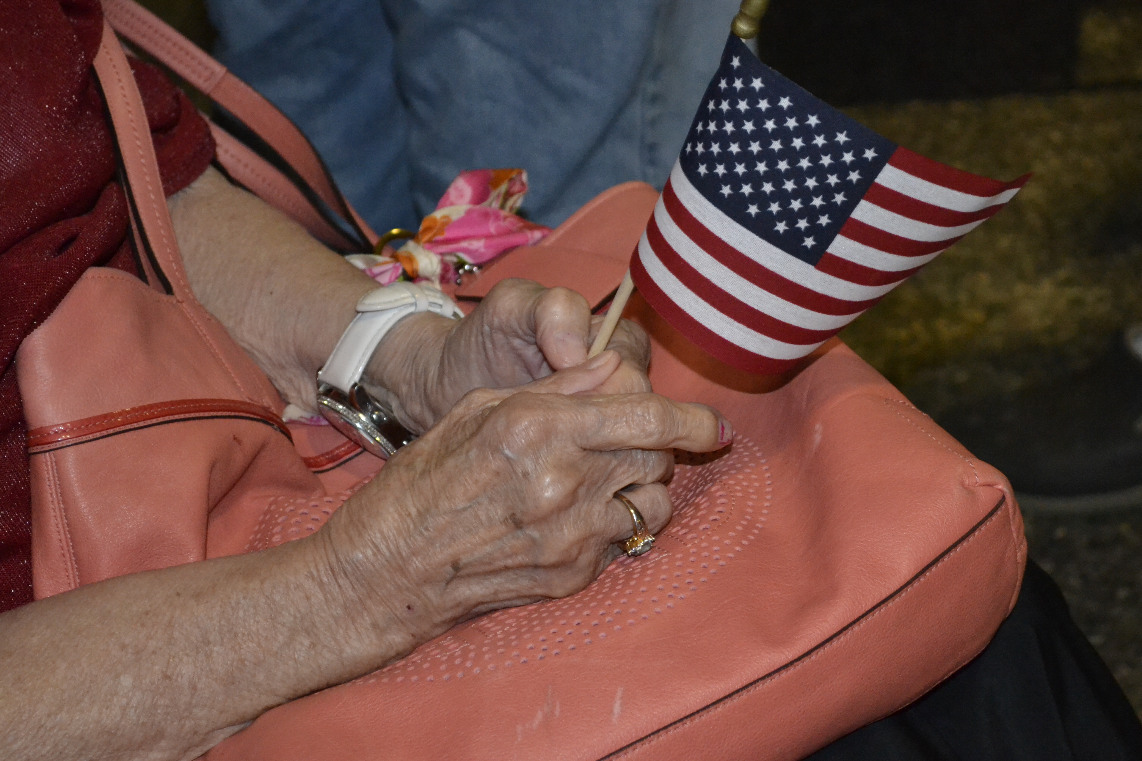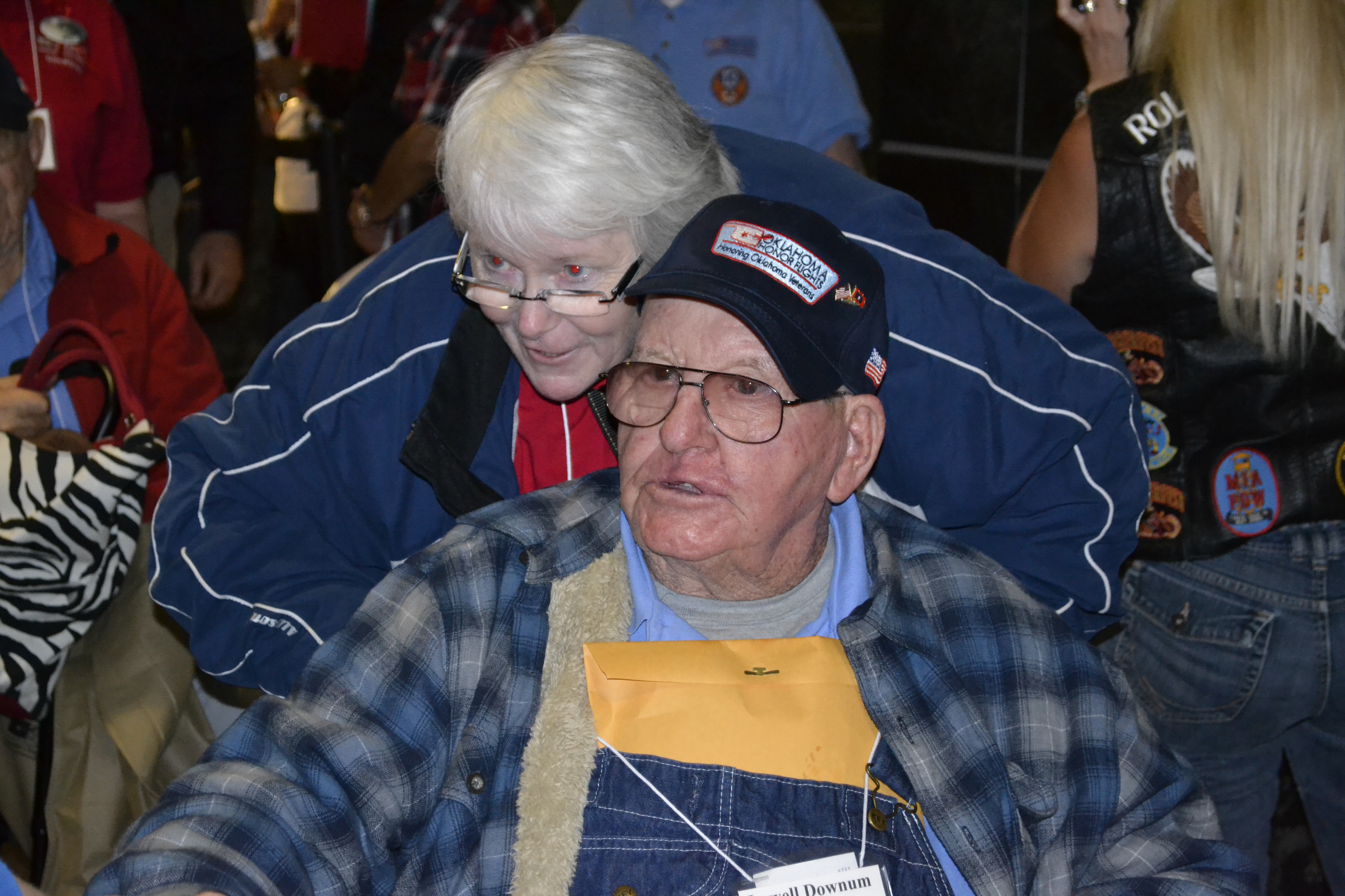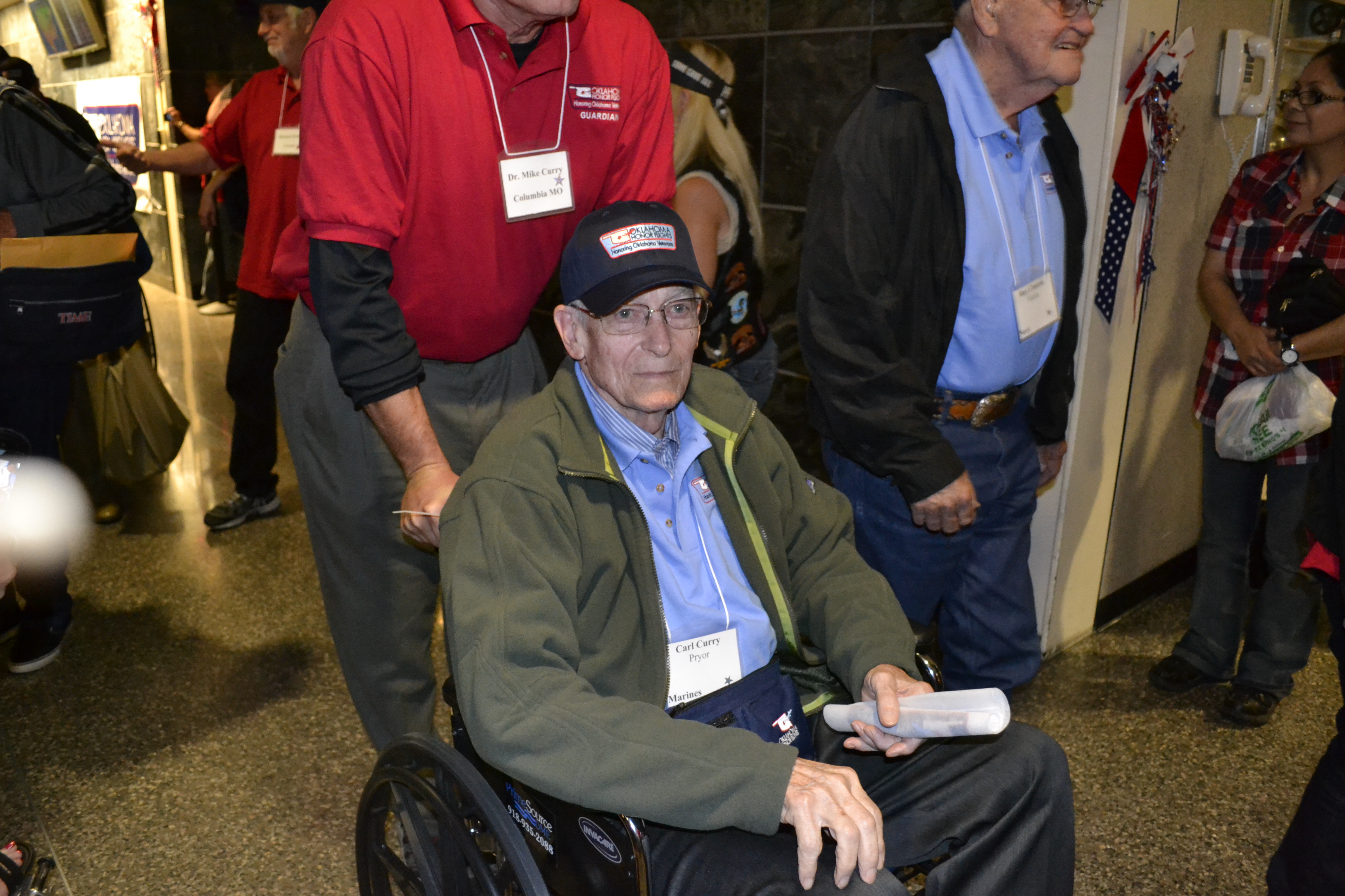 There were dozens of Patriot Guards and Oklahoma Honor Flight’s Ground Crew. Even a band from a local Tulsa homeschool group, entertained with patriotic tunes. Mary stood next to us. Her sweet mother was in a wheelchair and was there to welcome her husband of 63 years home from this flight. She clutched her flag in her hands and waited.
