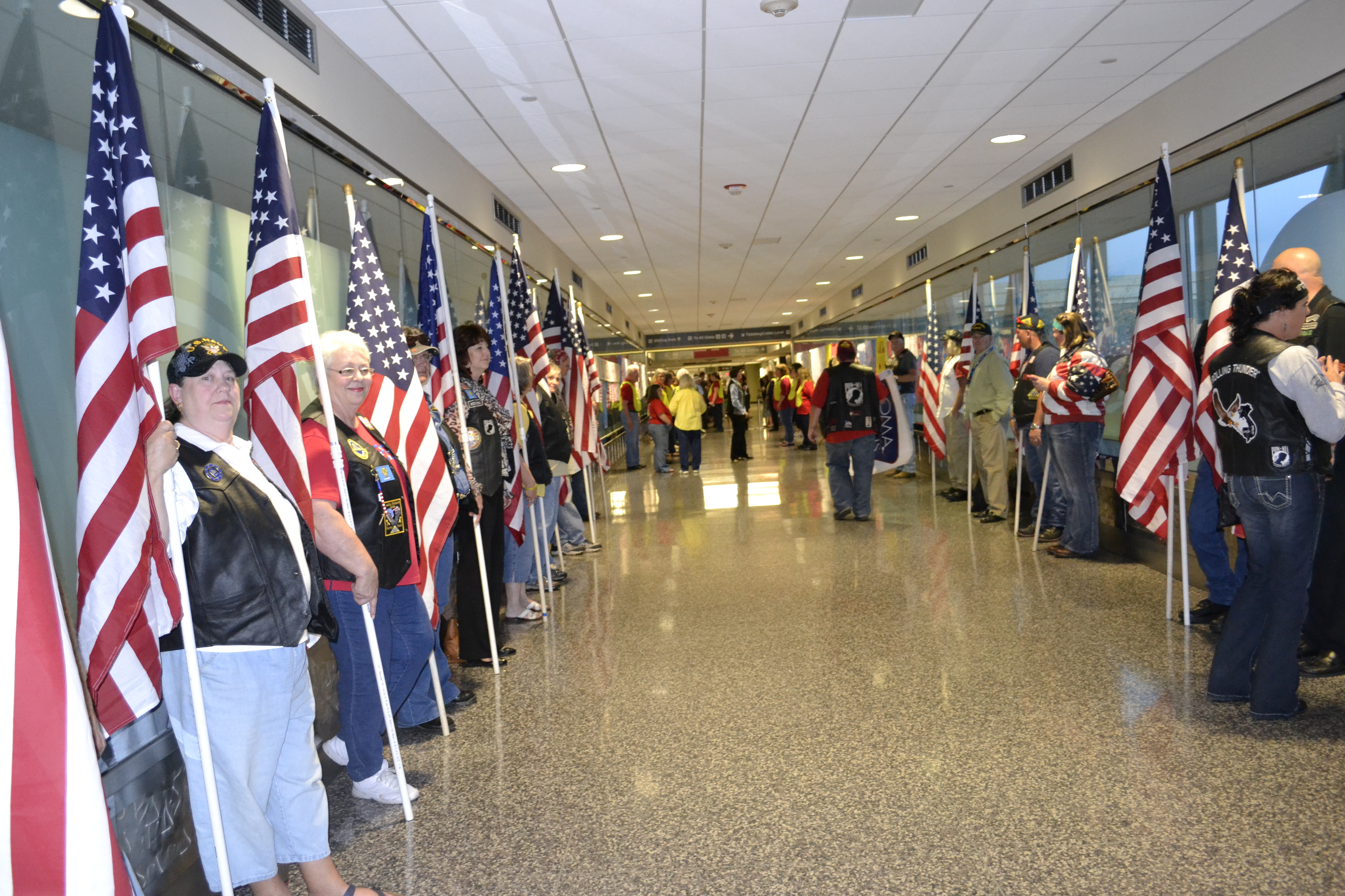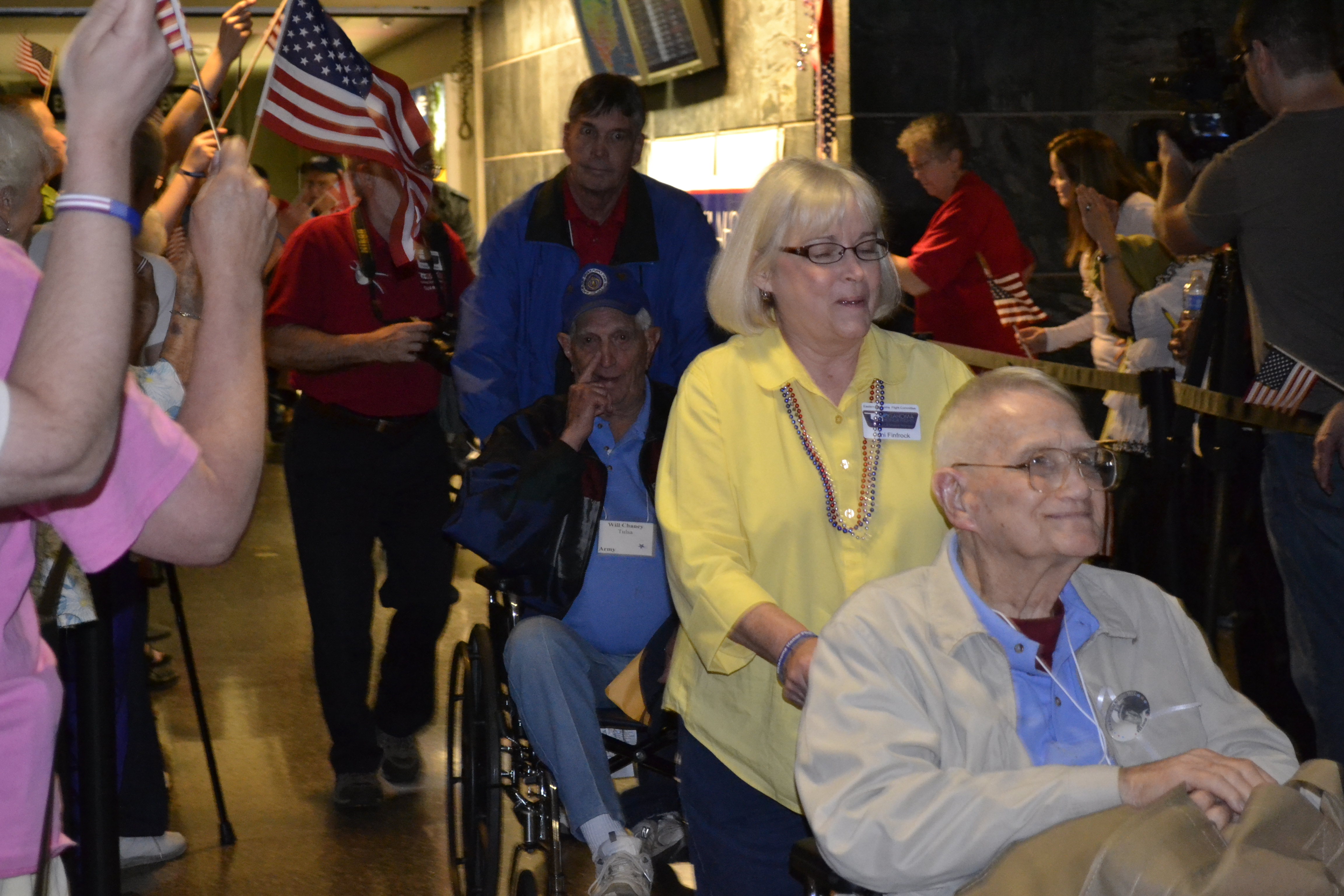 The Veterans and volunteers had met that morning at 4:30, boarded their chartered plane to Washington D.C., and now here we were waiting at 9:30 that evening for their return. How exhausted they had to be. But this was a trip of a lifetime. There would be no complaining ~