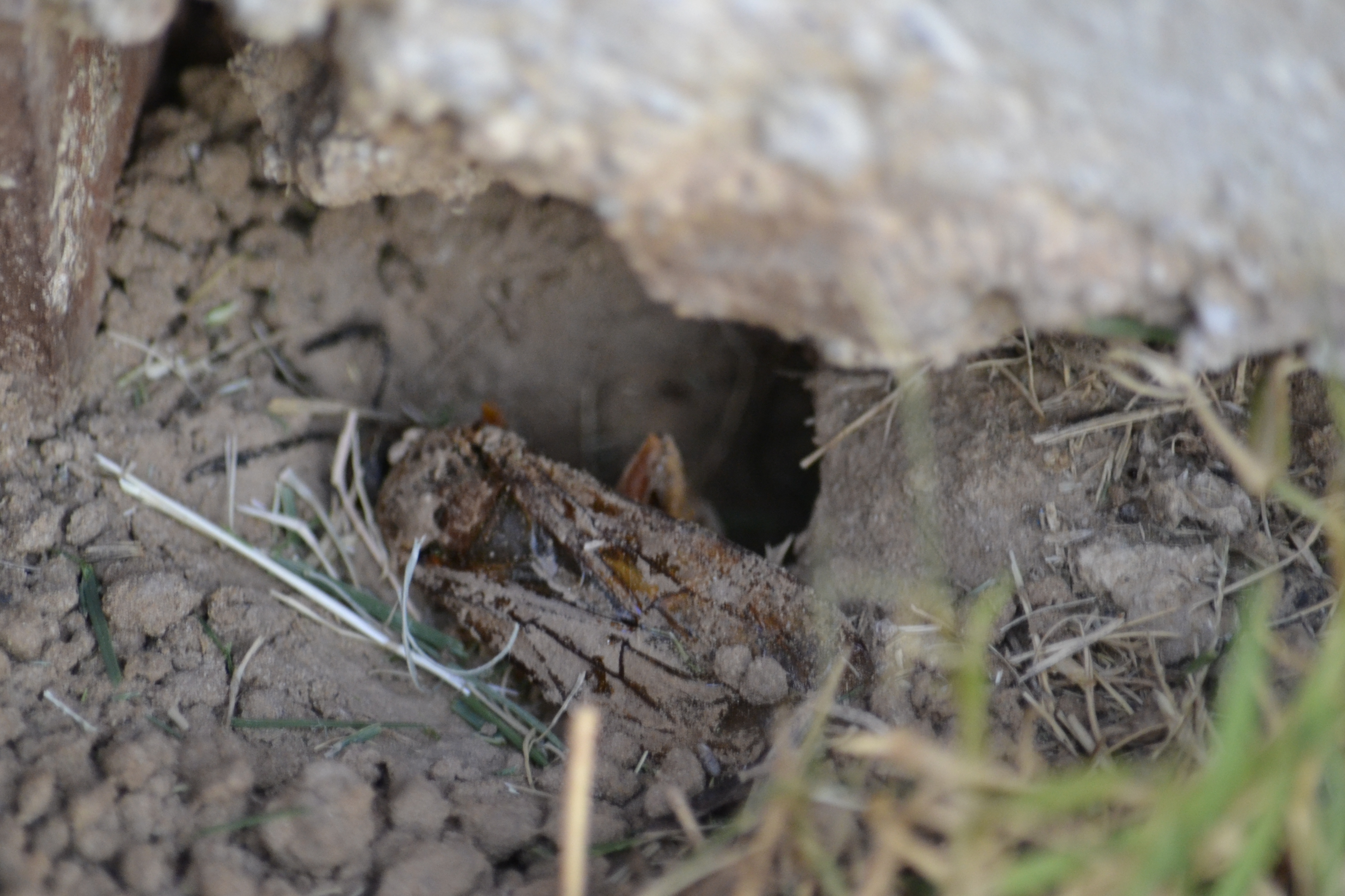 I have felt like a prisoner in my own home for a couple of weeks now.  My green grass is fading for lack of water.  There are sprigs of Bermuda grass popping up in my flower beds.  Some of the flowers are dying.  You are thinking drought, right?  The real reason?  I am a big chicken.  We have become infested with cicada killer wasps.  And each time I go outside, here they come. I never go out now without a can of hornet spray.  Last week I mowed the yard with the can tucked under my arm.  Several times I took off running, screaming, my arms flailing, while attempting to spray the varmint.  For any neighbors looking on, it has to be a hoot. I wonder if I’m on YouTube? 🙂                                                             cicada killer wasp mounds