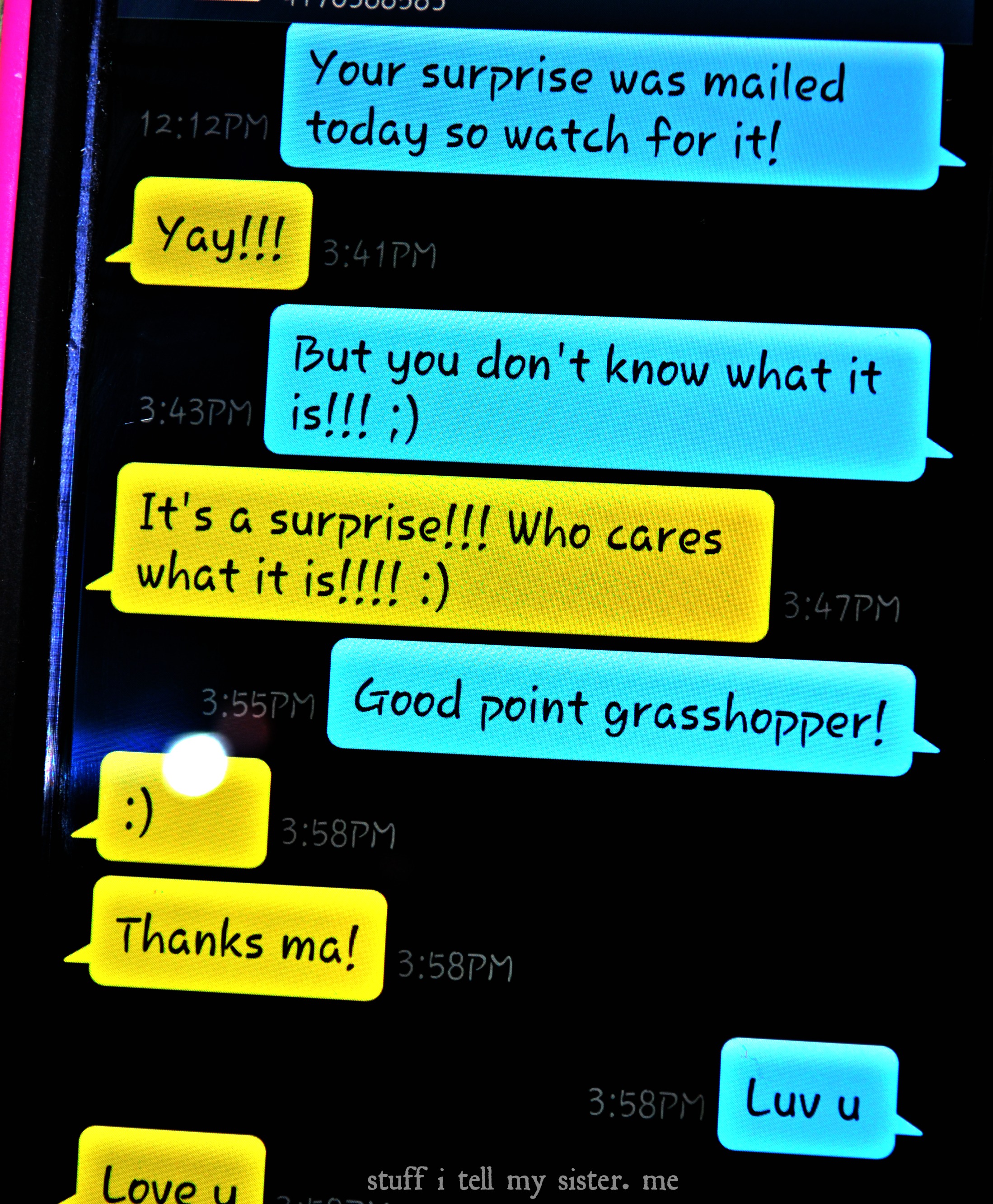 Love that!!! Kiddo and I just started texting and I love it. This is priceless! So, what’s the surprise!? 🙂