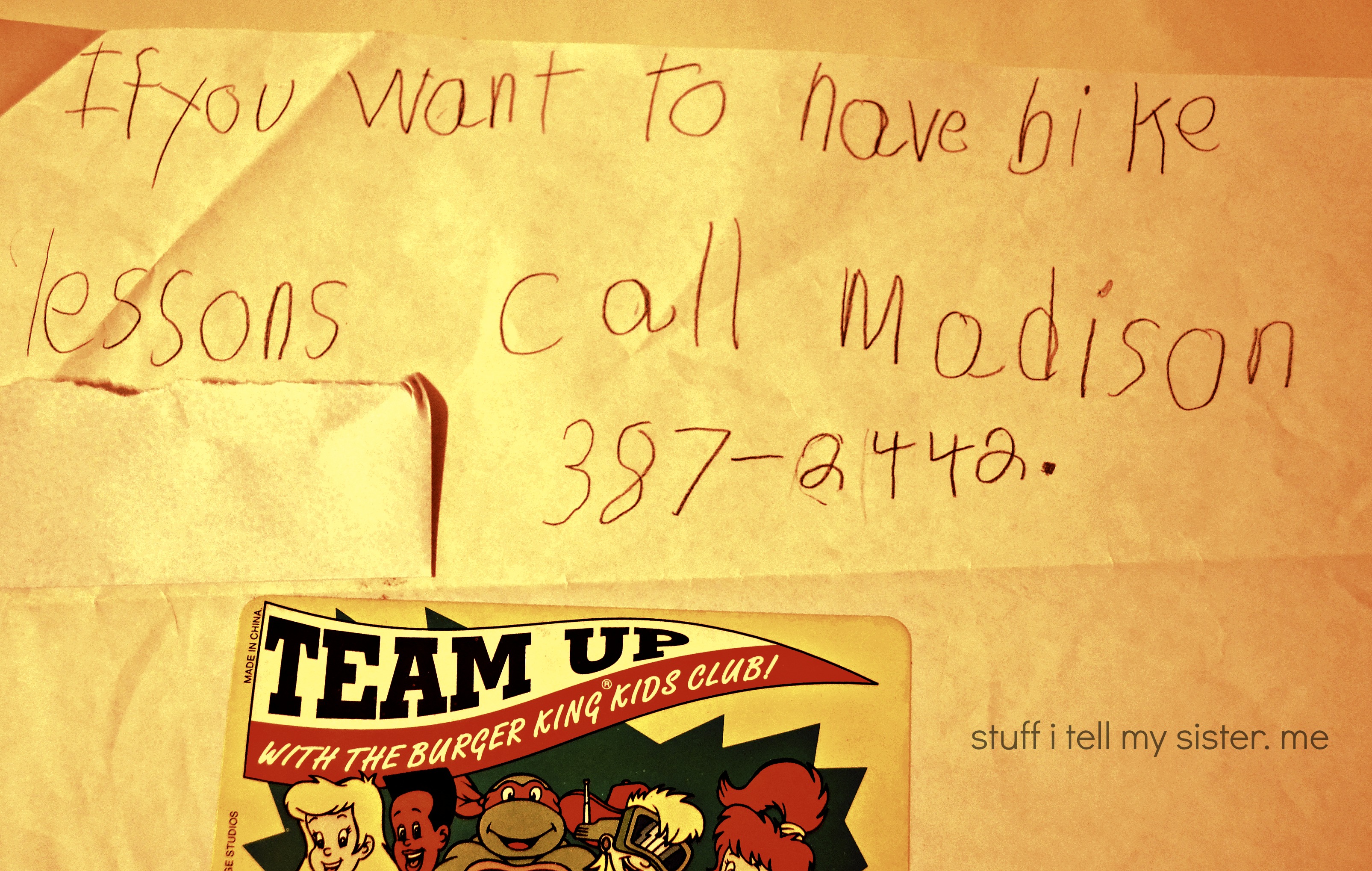 Love the bike lessons sign. Much better than a lemonade stand! The drawn letters always tug at my heart. Then they turn into middle school scribble! Saw a show on organizing that suggested taking photos of all the kid stuff they bring home from school. Taking photos sounds like a good idea, but could you throw away the original? Hmmmm…