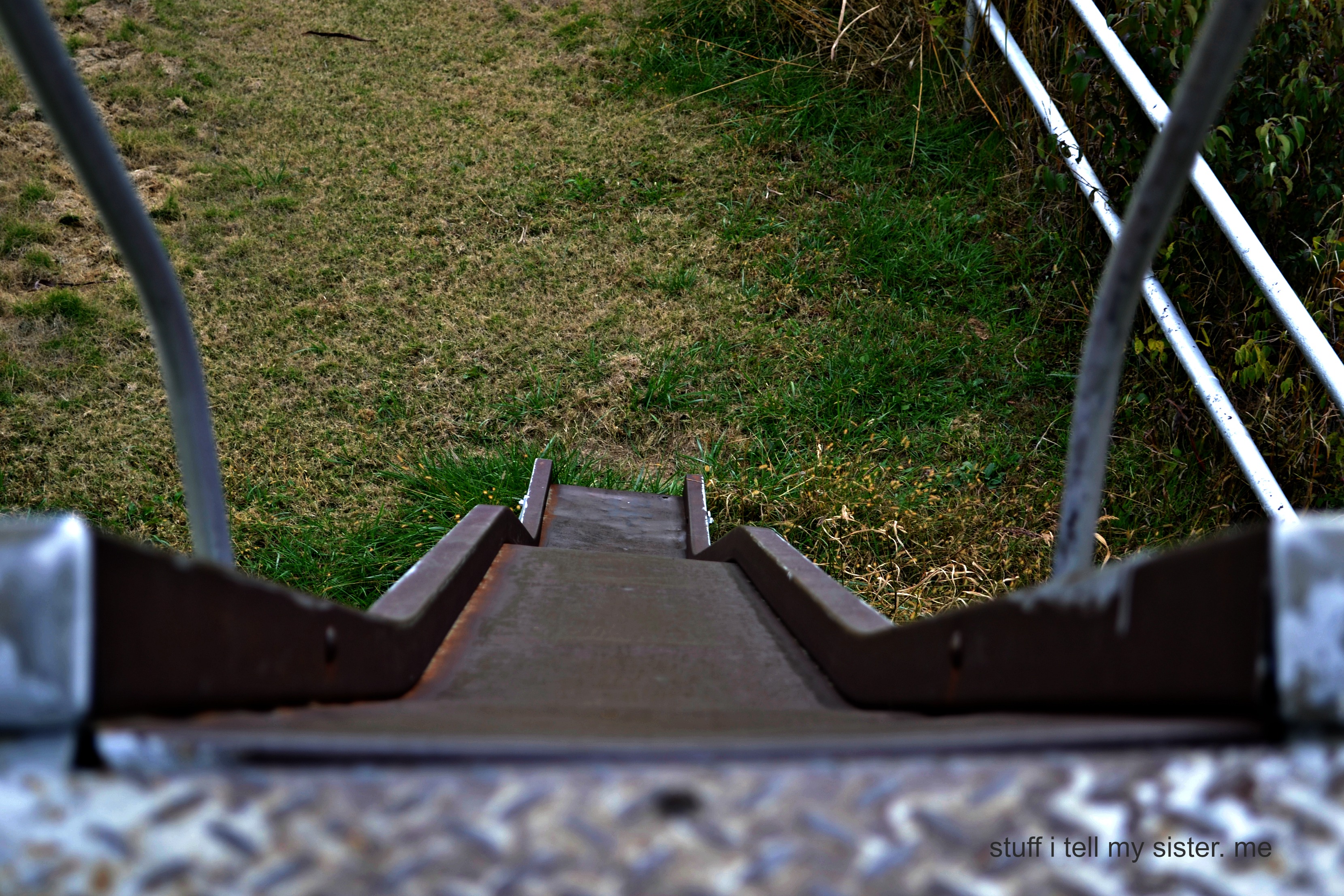 We sat in the car for a moment studying the grounds, then  jumped out to explore. The slide was calling my name, but the steps going up were a bit wiggly…and as much as I wanted to take off down the thing, the extreme tilt to the right, plus the rust spots here and there, made hubby think he might not be able to catch me.  #how long would it take the ambulance to find us?