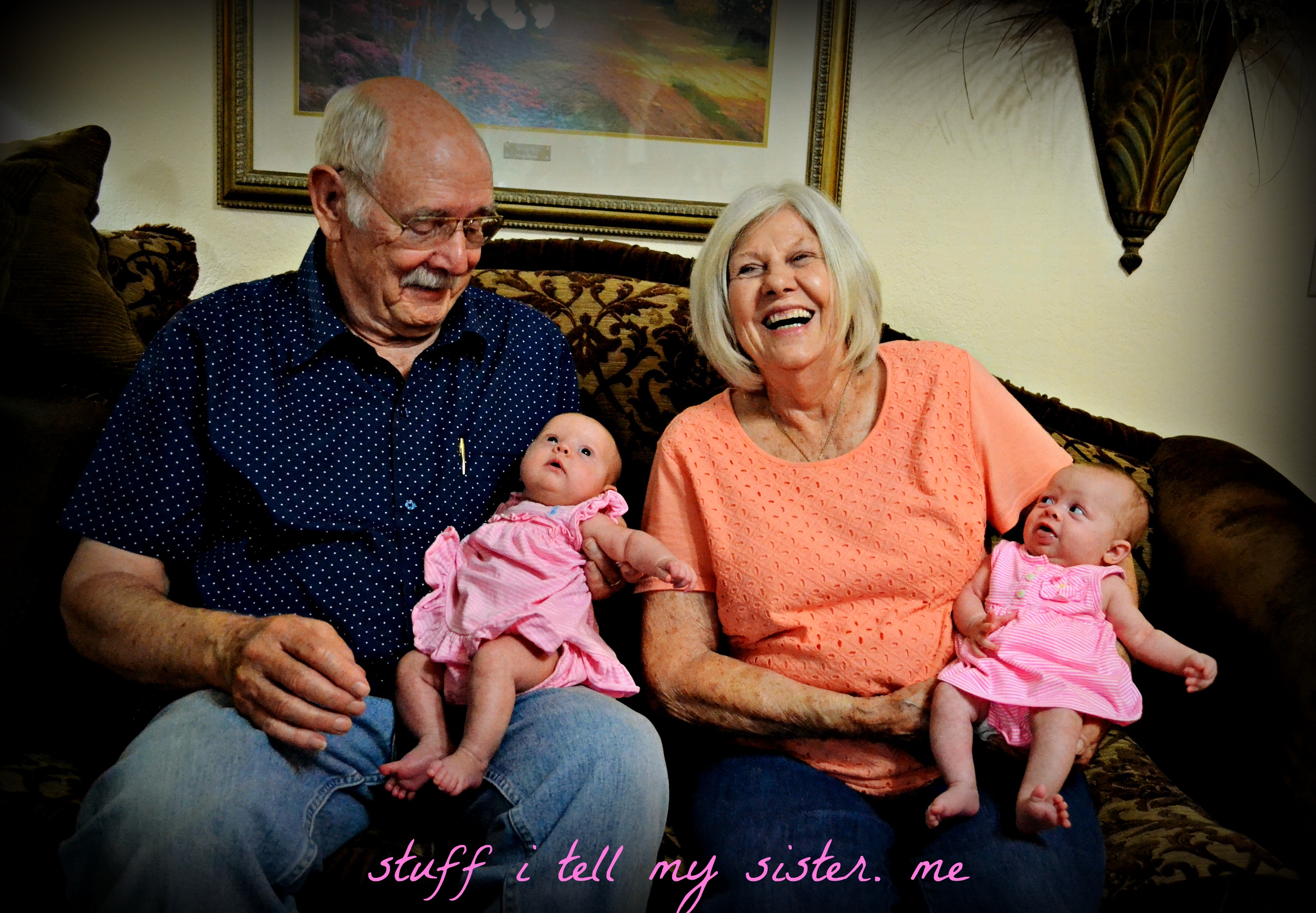 Our grands, Selah and Chloe, are now 8 weeks old. Just a day shy of two months. Over the weekend they got to meet GREATS! Great Nana and Papa and Aunts and Uncles and cousins, and, and, and. I think they were pretty good sports, all things considered. And they do not like giant pink bows.  Smile.