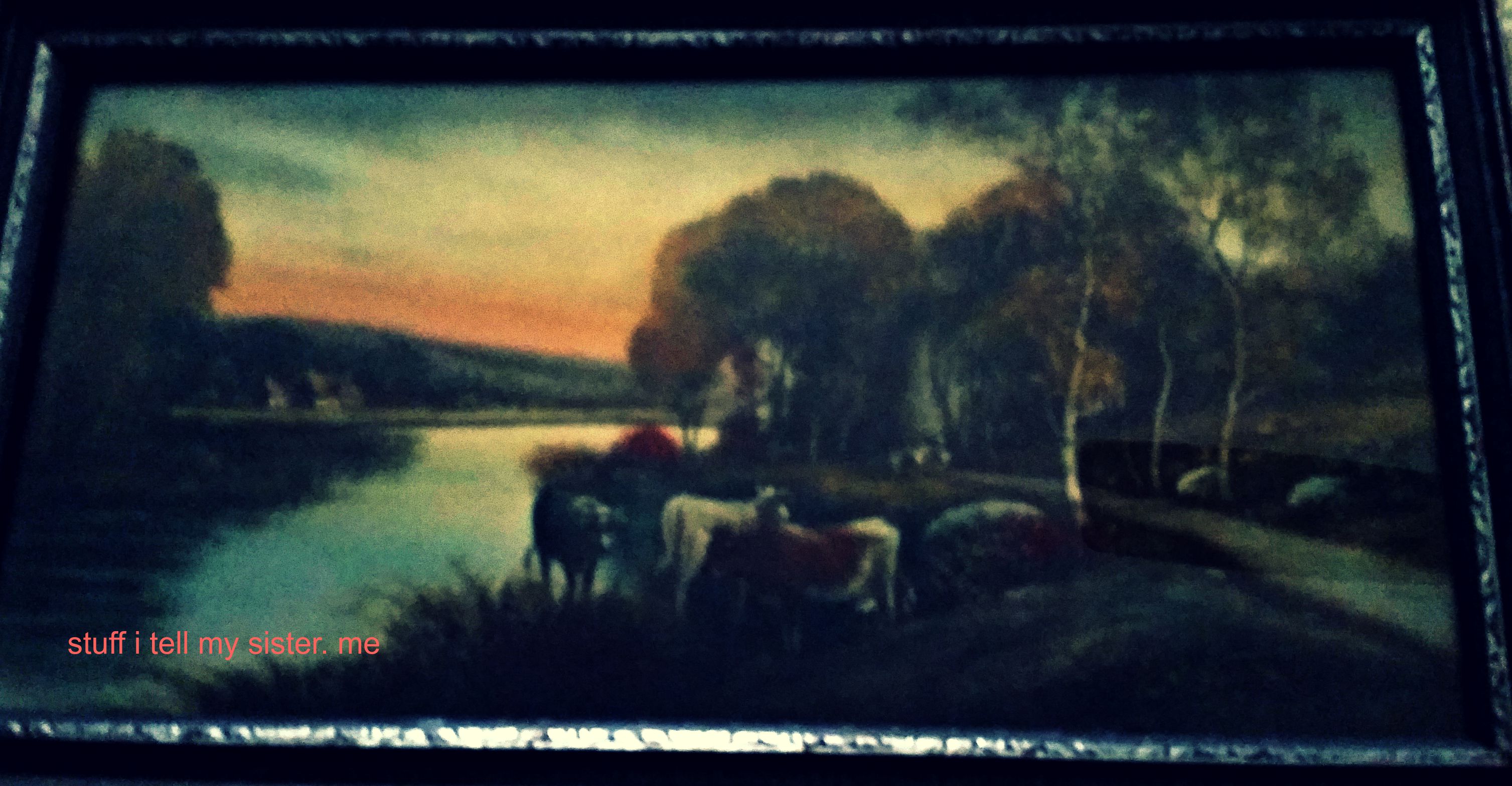 stolen picI wandered around a garage sale that held treasures from the life of someone else.  There were many vintage items and I adore vintage.  But we were on the road with limited room in the vehicle, so I settled on one item that I thought would mix well with my goodies at home.  The sticker said $2.00 and I handed the lady a five dollar bill.  She slowly looked behind her one way….then the other way….holding my money but not acknowledging me.  Then she said to another lady that stepped around the corner…. wasn’t this five dollars?  To which she replied, No….I changed it to two.  Her meaning then slapped me in the face.   If you are insinuating that I switched prices, you would be mistaken.  Her eyes got big and she  said…. um….No….  There were no apologies.  I took my change and my cow picture and then saw the look on hubby’s face as he had watched the accusation exchange.  I can’t believe you didn’t just leave without the picture!  I know….I have never been accused of stealing before either.  But I really wanted that picture for $2.00 ….so that’s why I still bought it.stolen pic 2