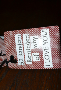 A while back I stumbled across a cute idea on www.pinterest.com and made a mental note, “I am going to do this for my hubby.” I bought a deck of cards and jumped on my computer to make my list of “52 Random Reminders of Why I Love You”. (Am I the only one who thinks this resembles a ransom note?) When I started, I was a little slow, honestly. But after about number ten, I became lost in my list and was having to do trade-outs to keep the number at 52! I still keep thinking of things I missed at the time and know I could easily…